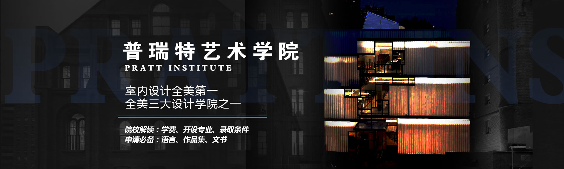普瑞特艺术学院(Pratt Institute)1887年建立,美国领军层次的设计类院校之一,作为一所专注于应用艺术型(Applied art)的老牌学院,与Parsons和FIT并称全美三大设计学院。 Pratt 室内设计系排名全美第一,建筑设计系本科排名全美第七; 2020 QS世界大学艺术与设计类专业排名TOP10,美国TOP5; Pratt 周围的美术馆、博物馆的展览,使用Pratt学生证,大部分展览可以免费; Pratt 经常会邀请业内大咖、设计师和当代艺术家来学校做讲座; 地理位置优越:Pratt 在纽约,坐拥全球最顶尖的设计资源。